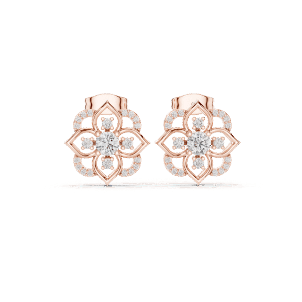 Graceful and captivating. These exquisite rose gold studs showcase a dazzling central diamond surrounded by a flower-inspired design of pave-set diamonds. A radiant choice for everyday charm or special moments.
